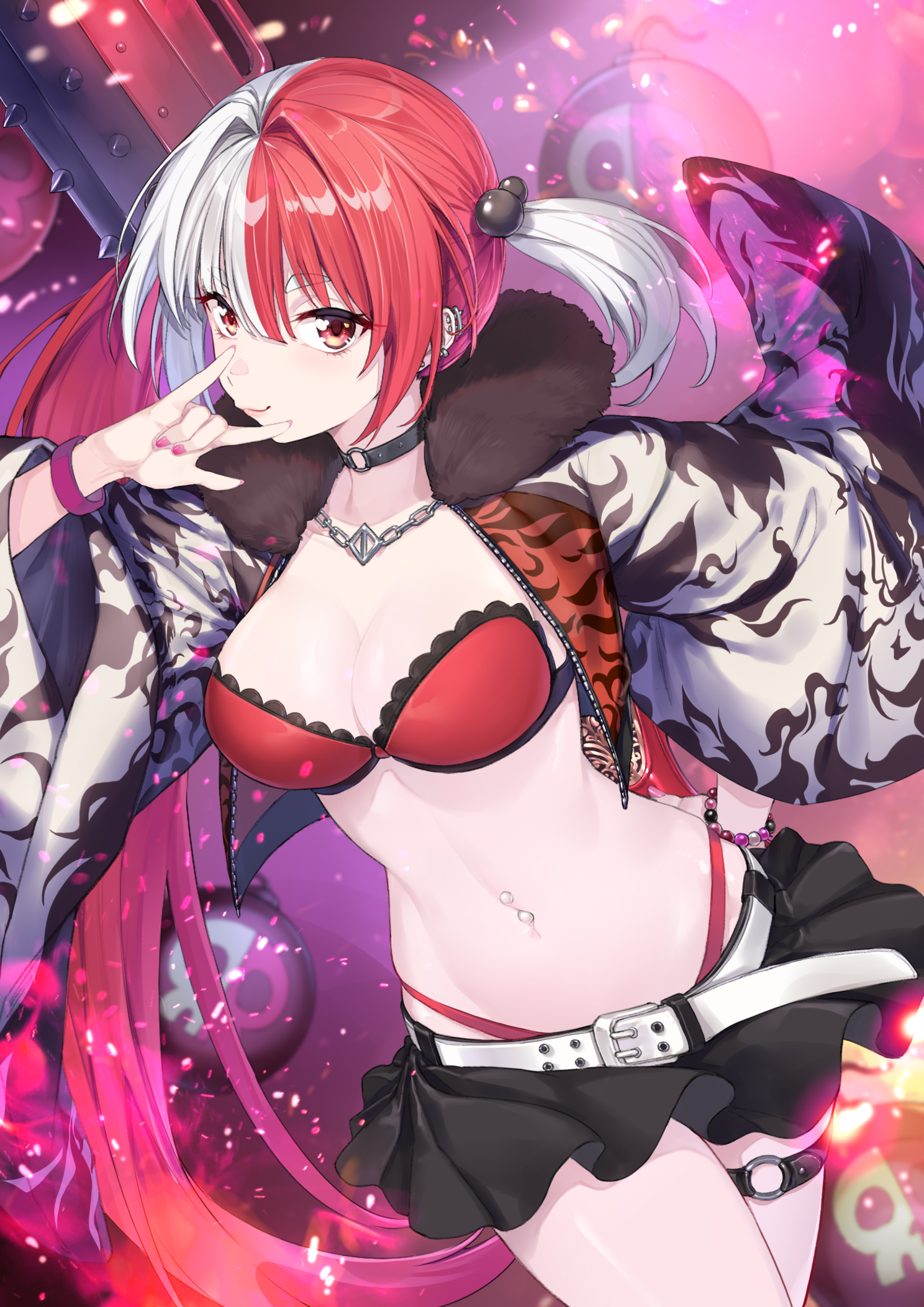 1girlbombbreastschainchain necklacechokercleavageexplosivehair bobbleshair ornamentjewelrylarge breastslong hairlooking at viewermulticolored hairnavelnecklacered eyesred hairsmilesolosplit-color hairthighstwintailswhite hair