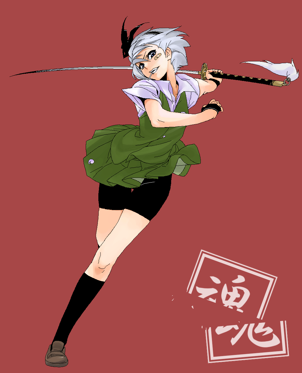 1girlbandaidbike shortsblue eyescontemporaryfemale focushairbandkatanaoekakiribbonshort hairsockssoloswordweapon