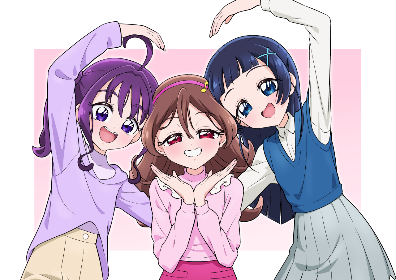 :d3girlsahogearched bangsarm upblouseblue eyesblue hairblue sweater vestborderbrown hairbrown shortscollared shirtcupping handsdouble-parted bangseighth notefortissimofrilled sweaterfrillsgrey skirtgrinhair between eyeshair intakeshair ornamenthairbandhalf-closed eyesheart armsheart arms triolong hairlong sleeveslooking at viewermedium hairminiskirtmultiple girlsmusical notemusical note hair ornamentopen mouthoutside borderown hands togetherpink backgroundpink hairbandpink skirtpink sweaterpleated skirtpurple eyespurple hairpurple shirtred eyesshirtshortsskirtsmilestandingsweatersweater vestteethturtleneckupper bodyupper teeth onlywhite borderwhite shirtx hair ornament