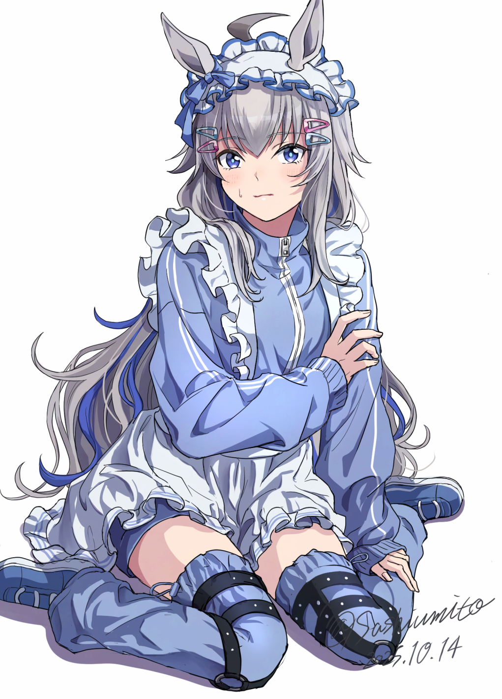 1girlahogealternate costumeanimal earsapronblue eyesblue hairblue jacketblue shortsblue thighhighsblushbowclosed mouthear bowfrilled apronfrillsgrey hairgrey tailhair between eyeshair ornamenthairbandhaircliphorse earshorse girlhorse tailjacketjersey maidlong hairlong sleeveslooking at viewermaidmaid apronmulticolored hairopen mouthshoesshortssimple backgroundsittingsolostreaked hairsweatdroptailthighhighstrack jacketunconventional maidwaist apronwarizawhite apronwhite backgroundwhite headdress