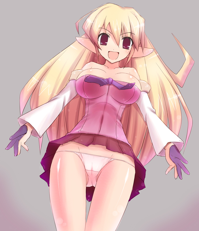 1girlblonde hairbreastselffemale focuslarge breastslong hairpantiespantyshotpointy earsred eyessolounderwearupskirt