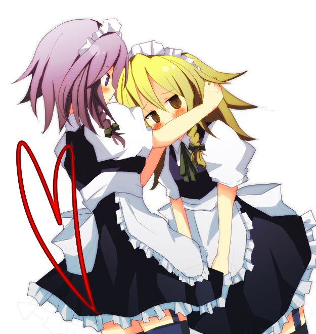 2girlsalternate costumeblonde hairblushcosplayenmaidedfemale focushairbandheartizayoi sakuya (cosplay)jitomemaidmultiple girlsribbonshort hairthighhighs