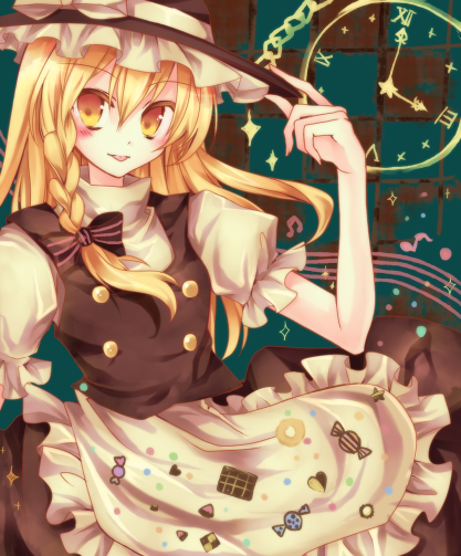 :p1girlblonde hairclockfemale focusfoodhatlong hairribbonsolotonguetongue outwitchwitch hatyellow eyes