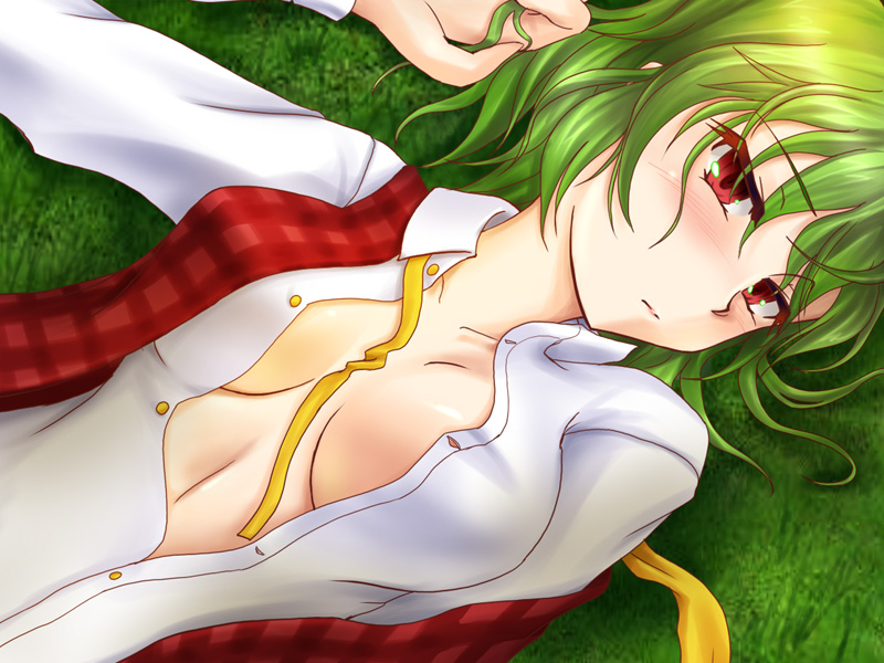 1girlblushbreastsbreasts apartfemale focusgrassgreen hairlarge breastslyingon backopen clothesopen shirtplaid clothesplaid vestred eyesribbonshirtshort hairsolovest