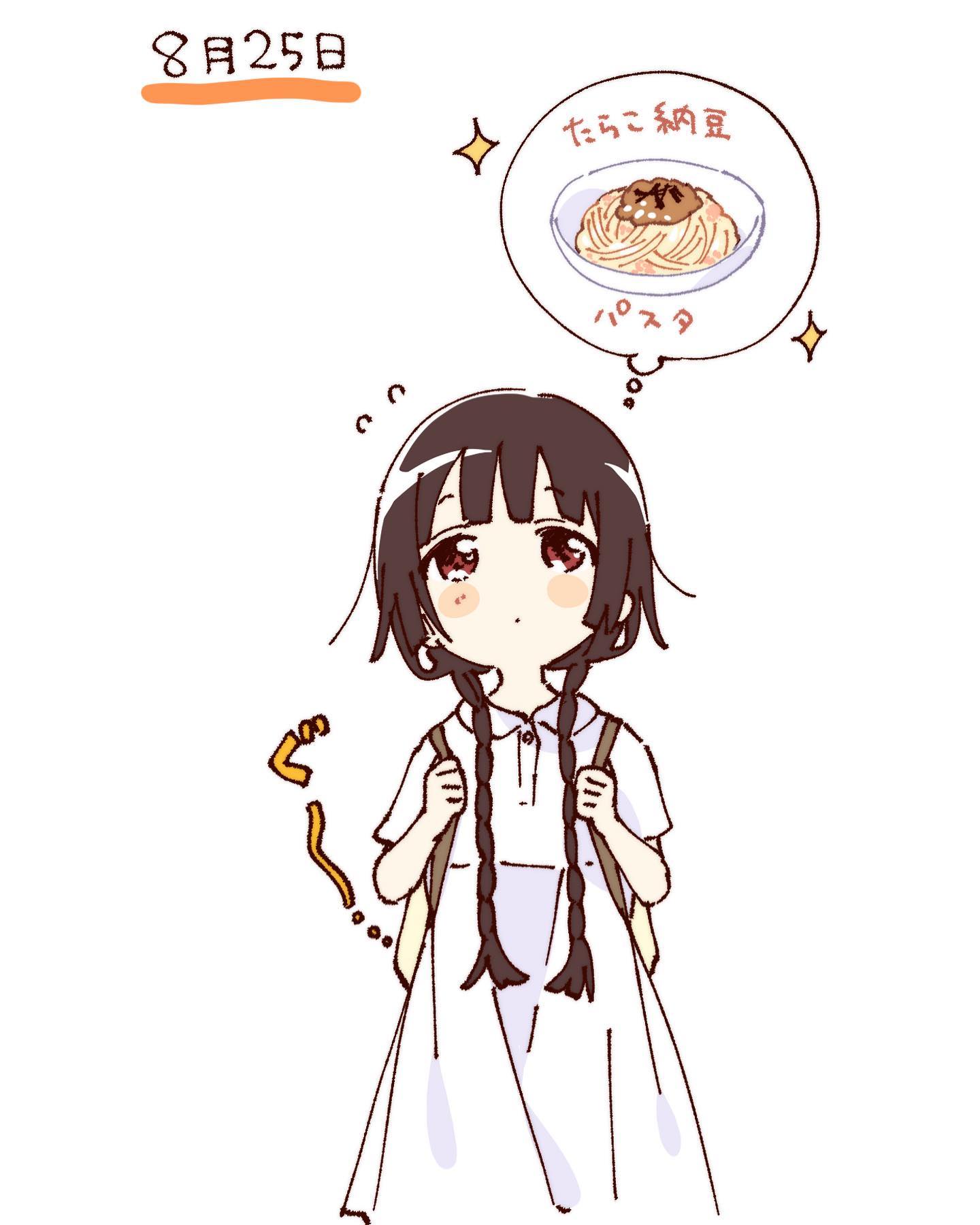 1girlbackpackbagblunt bangsblush stickersbraidbrown hairclosed mouthcollared dresscropped legsdressflying sweatdropsfoodlong hairpastared eyesshort sleevessimple backgroundsolospoken foodstandingtwin braidswhite backgroundwhite dress