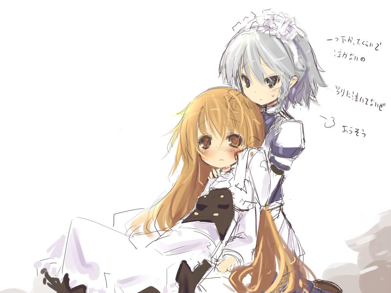 2girlsblonde hairblushbrown hairfemale focuslong hairmaidmultiple girlsshort hairsketchwhite background