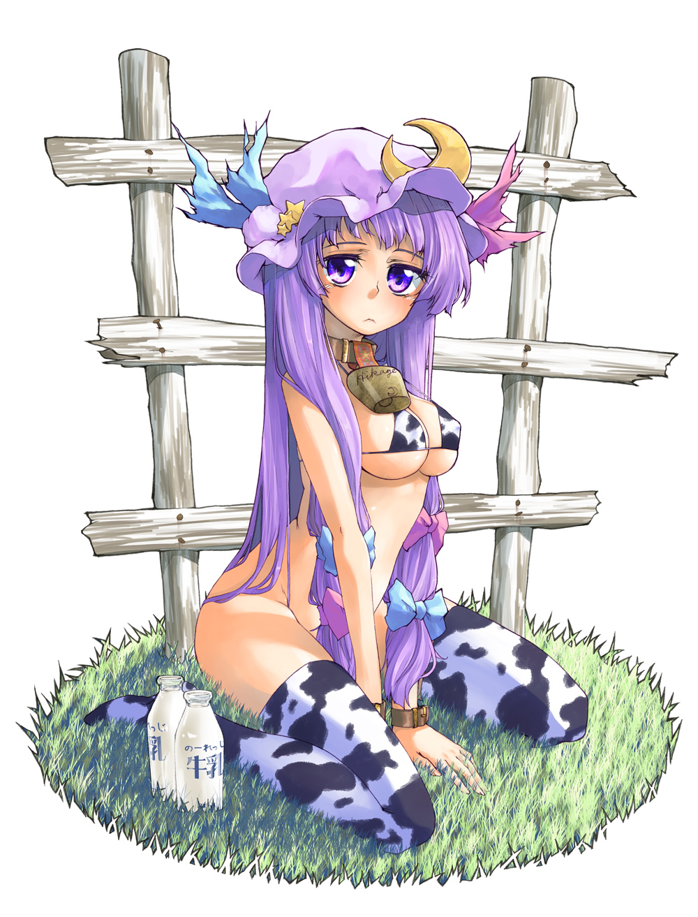 1boy1girlanimal printbellbikinibottlebottomlessbowbreastscollarcow printcrescentcrescent hat ornamentfemale focushair ribbonhathat ornamentkneelinglarge breastslong hairmicro bikinimilkmilk bottleneck bellno pantiespink bowpurple eyespurple hairribbonsoloswimsuitthighhighsunderboob