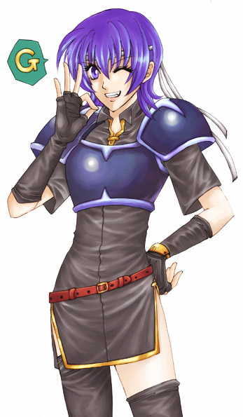 1girlarmorbeltblue eyesblue hairbootsfemale focusfingerless glovesgloveshand on own hipheadbandhip focuslowlegmatching hair/eyesone eye closedpurple eyespurple hairshort hairside slitsimple backgroundsmilesolothigh bootsthighhighswhite backgroundwink