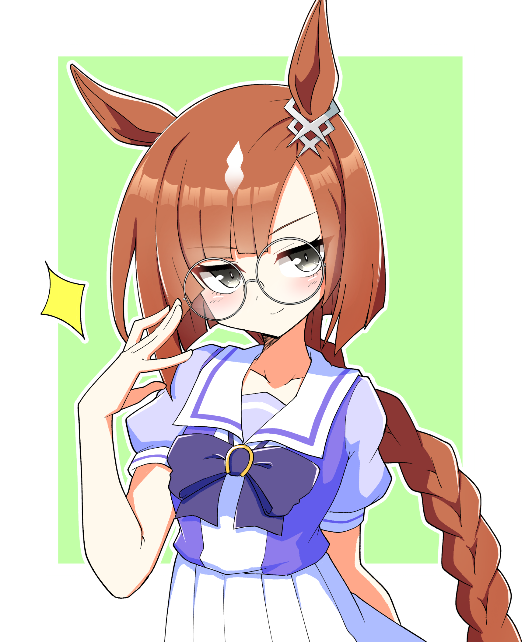 animal earsbowbraidbraided ponytailbrown hairear ornamentears through headwearglassesgrey-framed eyewearhorse earshorse girllong hairlooking at viewermulticolored hairround eyewearschool uniformsmiletracen school uniform