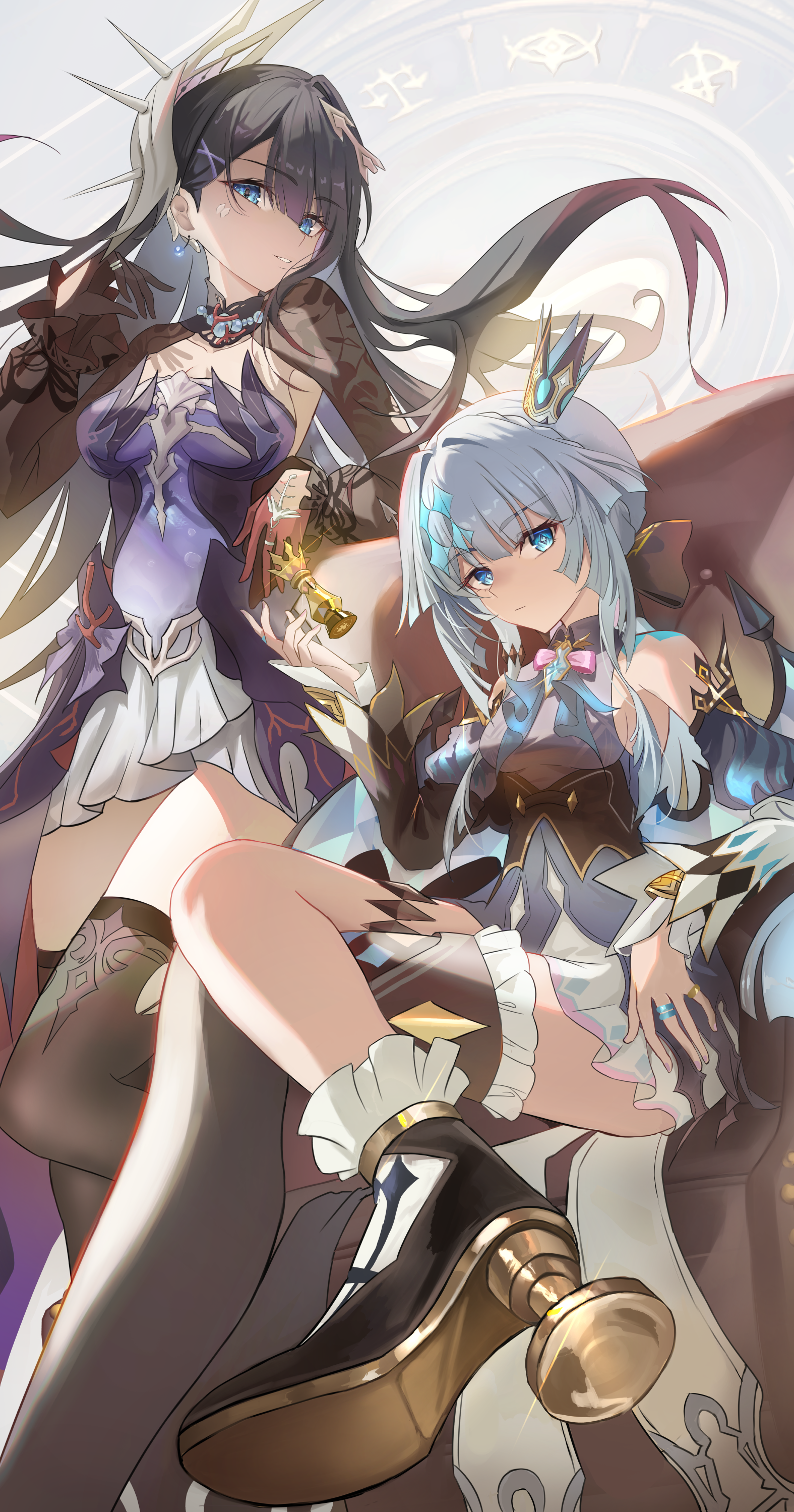 2girlsasymmetrical glovesbare shouldersblack dressblack glovesblack hairblack shrugblack thighhighsblue dressblue eyesbreastschess piececlosed mouthcolored inner haircrossed legscrowndetached sleevesdiamond (shape)diamond-shaped pupilsdressearclipearringsglovesgrey hairhair ornamenthalf gloveshand upjewelrylarge breastslong hairlong sleeveslooking at viewermedium breastsmismatched glovesmulticolored hairmultiple girlsparted lipsred glovessee-through bodyshrug (clothing)single thighhighsittingskirtsymbol-shaped pupilsthighhighsthighstorn clothestorn thighhighswhite skirt