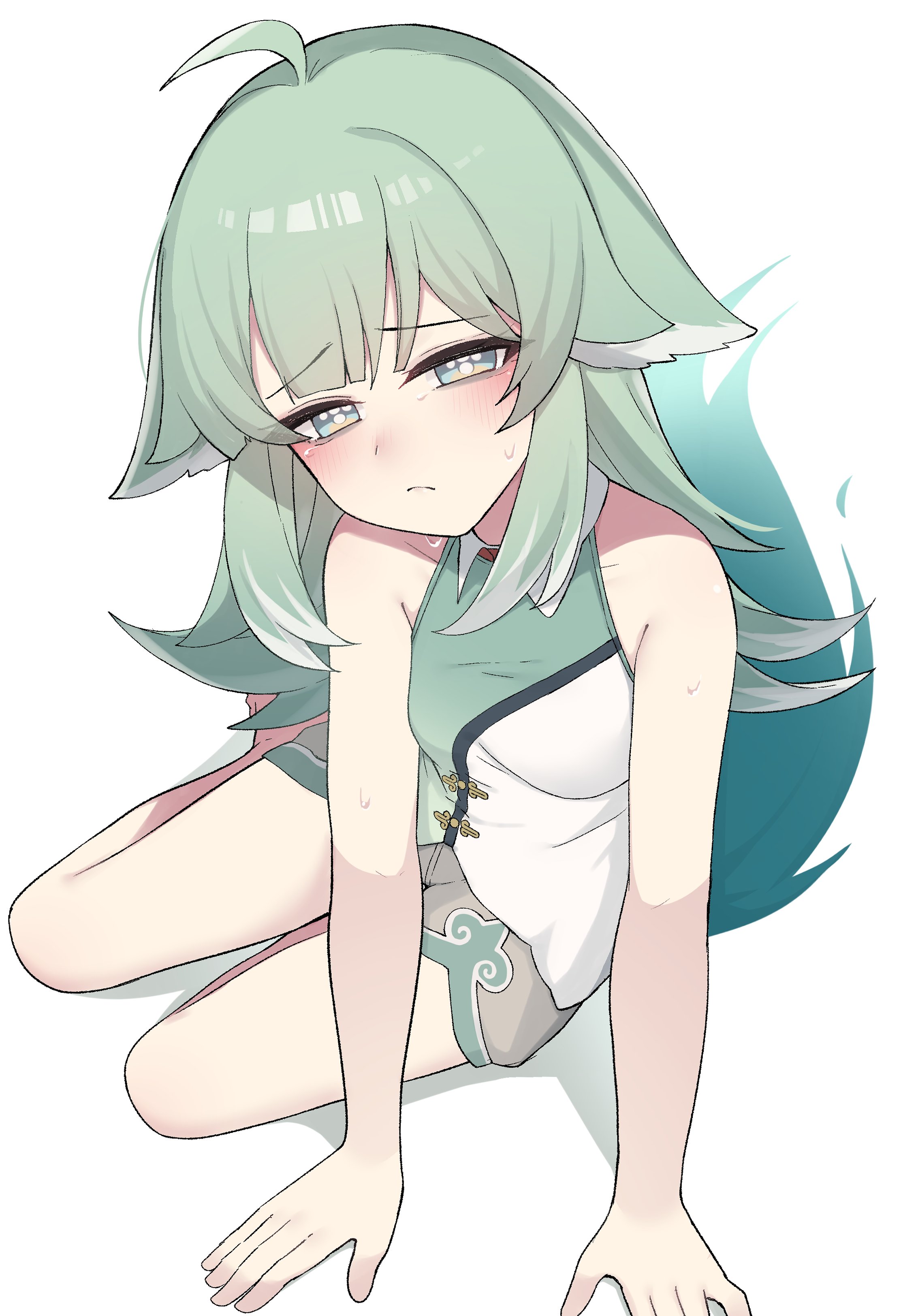 1girlahogeanimal earsarm supportbare armsbare shouldersblushbreastsclosed mouthfox earsfox girlfox tailgreen eyesgreen hairgreen shirtlong hairlooking at viewershirtshortssimple backgroundsittingsleevelesssleeveless shirtsolosweattailwhite backgroundyokozuwari