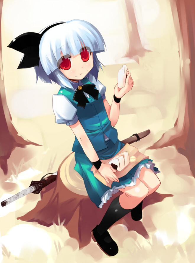 1girleatingfemale focusfoodfood on faceforestfrom abovemary janesnatureonigirioutdoorsplantred eyesshoesskirtsolotree stumpwristband