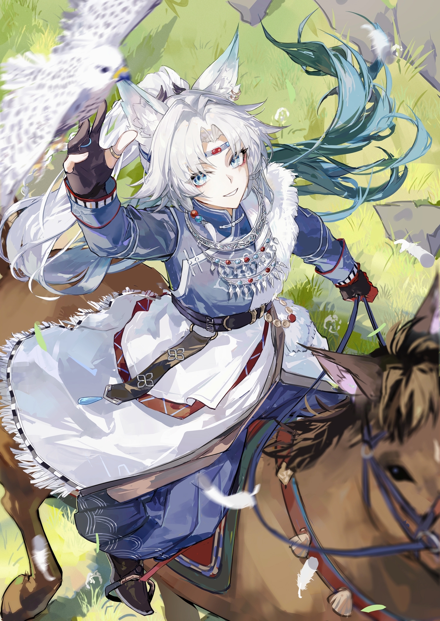 bibinggwas2, kaito (vocaloid), vocaloid, absurdres, highres, 1boy, blue eyes, blue hair, blue nails, blue scarf, closed mouth, hair between eyes, heart, heart-shaped pillow, hugging object, jacket, looking at viewer, male focus, pillow, pillow hug, scarf, short hair, simple background, smile, solo, white background, white jacket