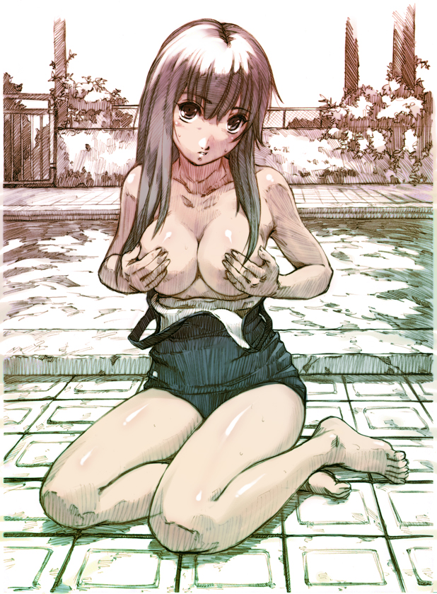 1girlbarefootbreastsclothes pullcovering breastscovering privatesfeetfemale focuslarge breastsmonochromeone-piece swimsuitone-piece swimsuit pullpoolschool swimsuitsittingsoloswimsuittopfreedomtopless female