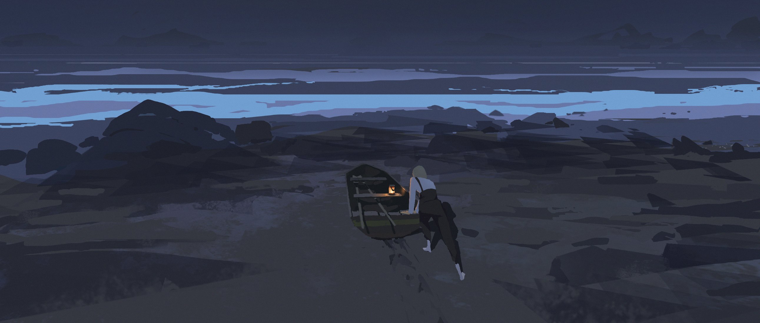 1girlblonde hairboatdarkdredge (video game)full bodylanternmountainous horizonpushingsceneryshirtshoreshort hairsolosuspenderswatercraftwhite shirt