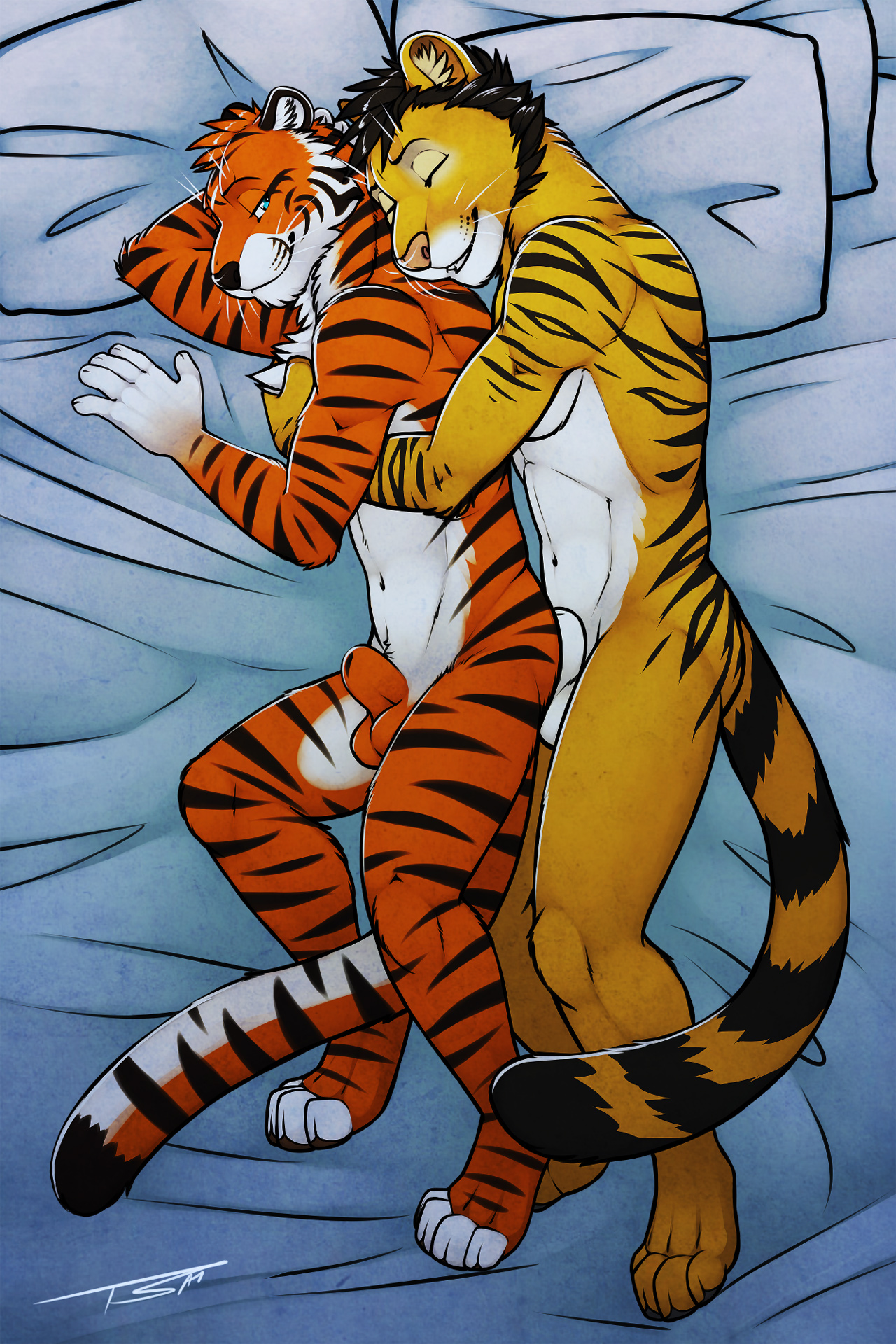 4 toes5 fingersanimal genitaliaanthroathleticballsbedbed sheetbeddingbicepsblack furblack hairblack noseblack stripesboompumachest tuftclosed eyescougarcuddlingcyan eyesdipstick tailduoeyebrowsfelineFlag for Deletionfully sheathedfurgloves (marking)hairhalf-closed eyeshand behind headhigh-angle viewinner ear fluffinsidelooking backlyingmalemammalmarkingsmulticolored furmulticolored tailnavelnudeon bedon sideorange furpecspillowpink noseringed tailromantic couplesheathsignaturesmilespooningstripesteethtigertoeless (marking)toestufttwo-tone tailwhiskerswhite furyaoiyellow fur