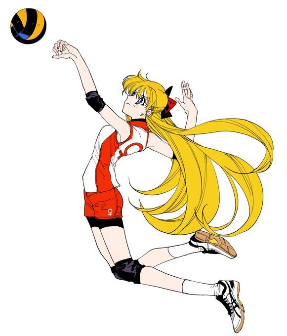 1girlballblonde hairfull bodylong hairmars symbolred shortsshirtshoesshortssimple backgroundsleevelesssleeveless shirtsneakerssockssolosportswearvolleyballvolleyball (object)volleyball uniformwhite backgroundwhite socks