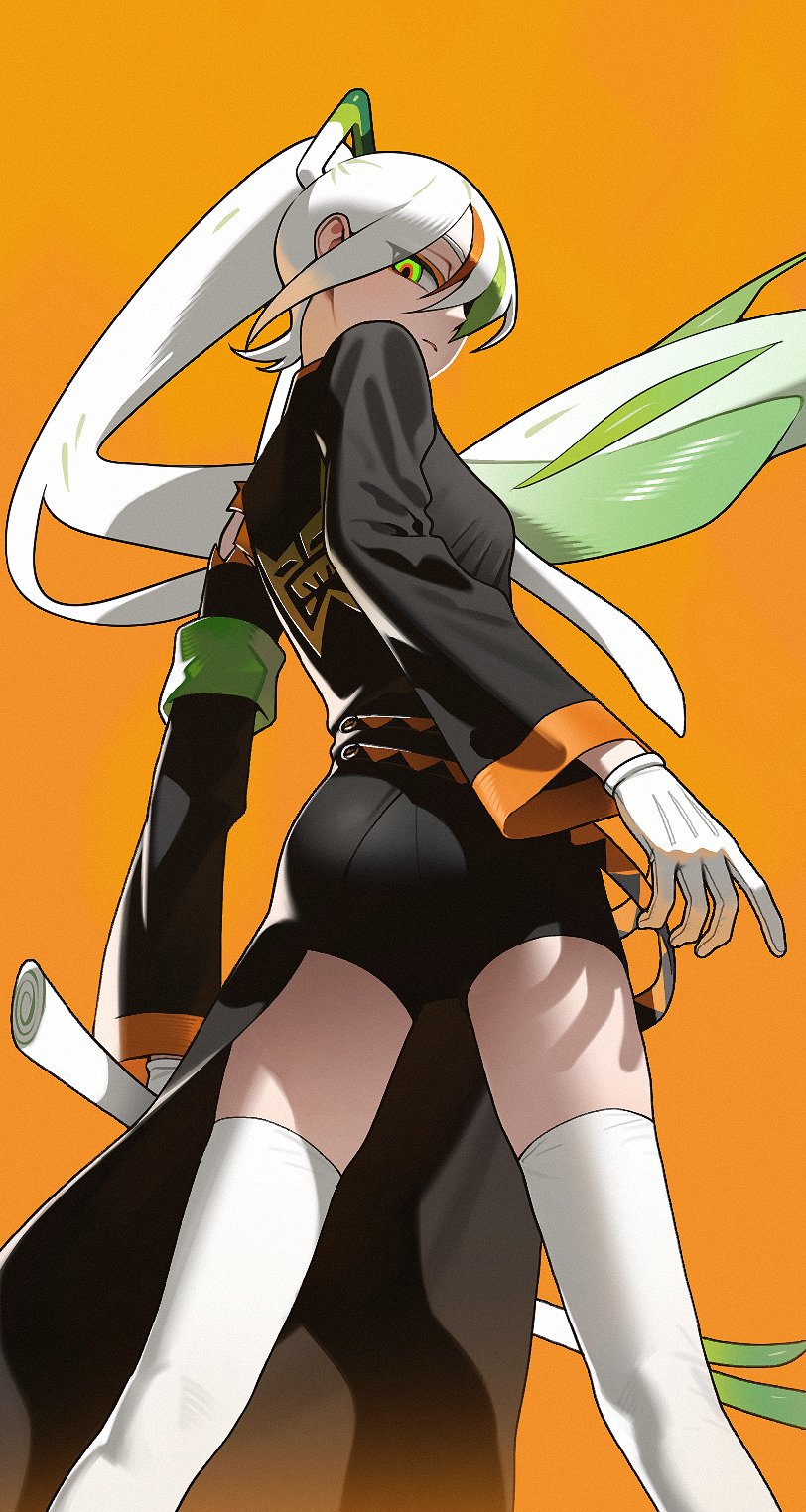 1girlarmbandblack coatclosed mouthcoatfoodfrom belowglovesgreen eyesholdingholding foodholding spring onionholding vegetablelong hairlong sleeveslooking downnecktieorange backgroundsolospring onionthighhighsvegetablewhite gloveswhite hairwhite necktiewhite thighhighs