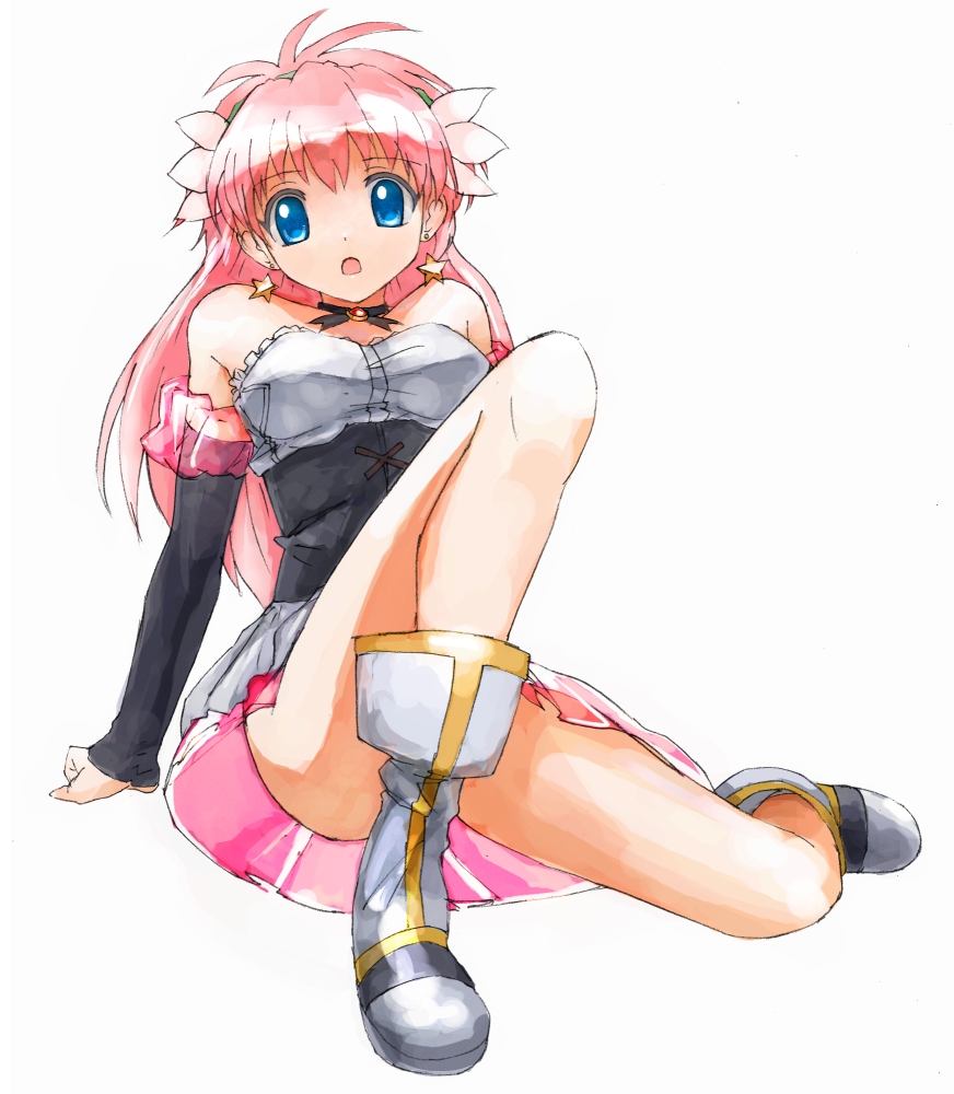 :o00s1girlbare legsbare shouldersblue eyesbootscensoredconvenient censoringconvenient legearringselbow glovesfemale focusflowergloveshair flowerhair ornamentjewelrylong hairlooking at vieweropen mouthpink hairsimple backgroundsittingsolostar (symbol)star earrings