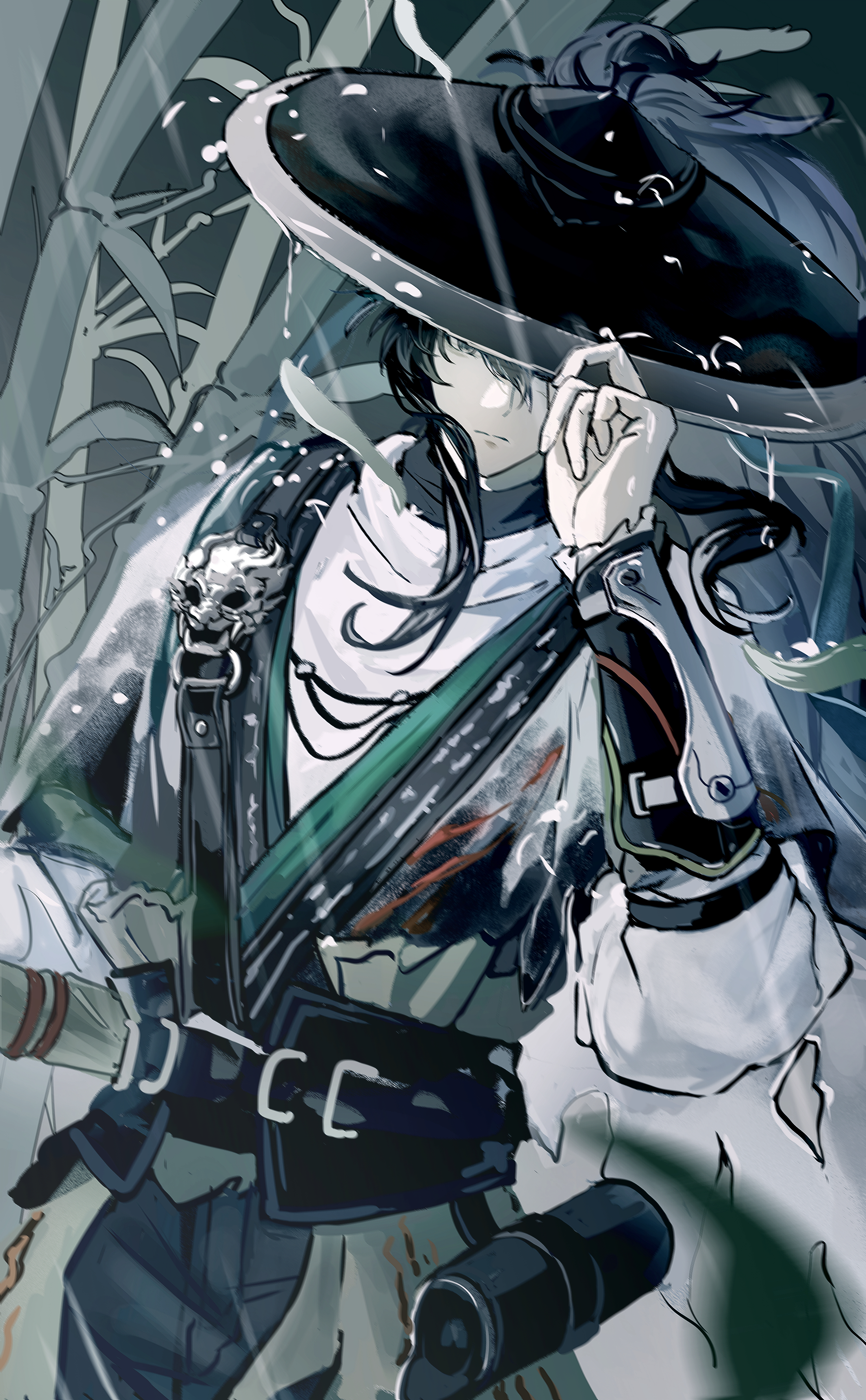 xrjingx, merlin (fate), fate/grand order, fate (series), 1boy, antennae, closed mouth, falling petals, male focus, medium hair, monochrome, petals, robe, smile, solo, spiked hair, white hair