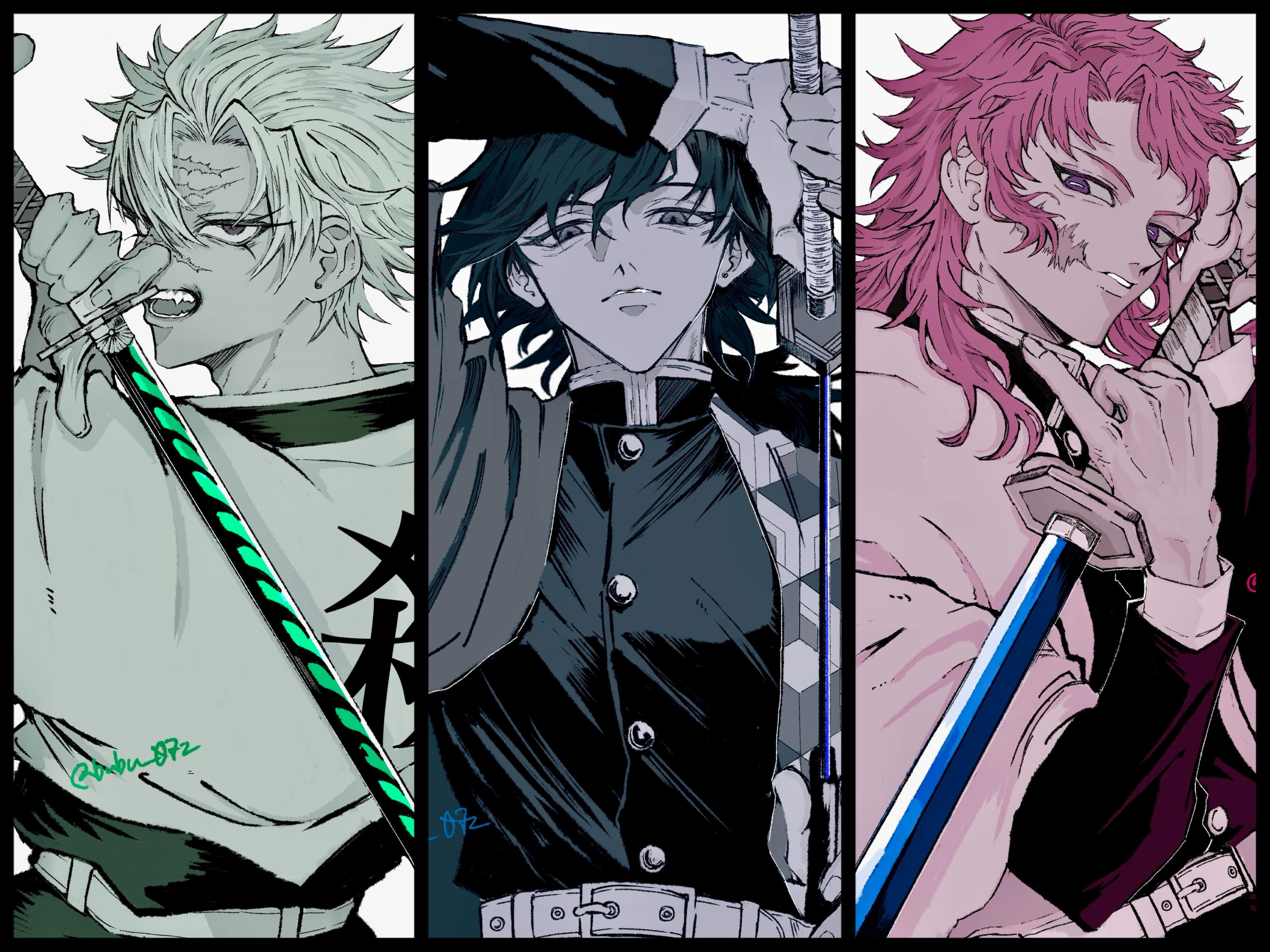 3boysalternate hair colorbeltblack hairblack jacketblack pantsblue eyesbubu 072buttonsdemon slayer uniformfacial scarhaorihigh collarholdingholding swordholding weaponjacketjapanese clotheskatanakikkoumonlong hairlooking at viewerlow ponytailmale focusmultiple boyspantsparted lipspink hairponytailprint haoripurple eyesscarscar on cheekscar on facesimple backgroundspiked hairswordteethupper bodyweaponwhite backgroundwhite beltwhite haori
