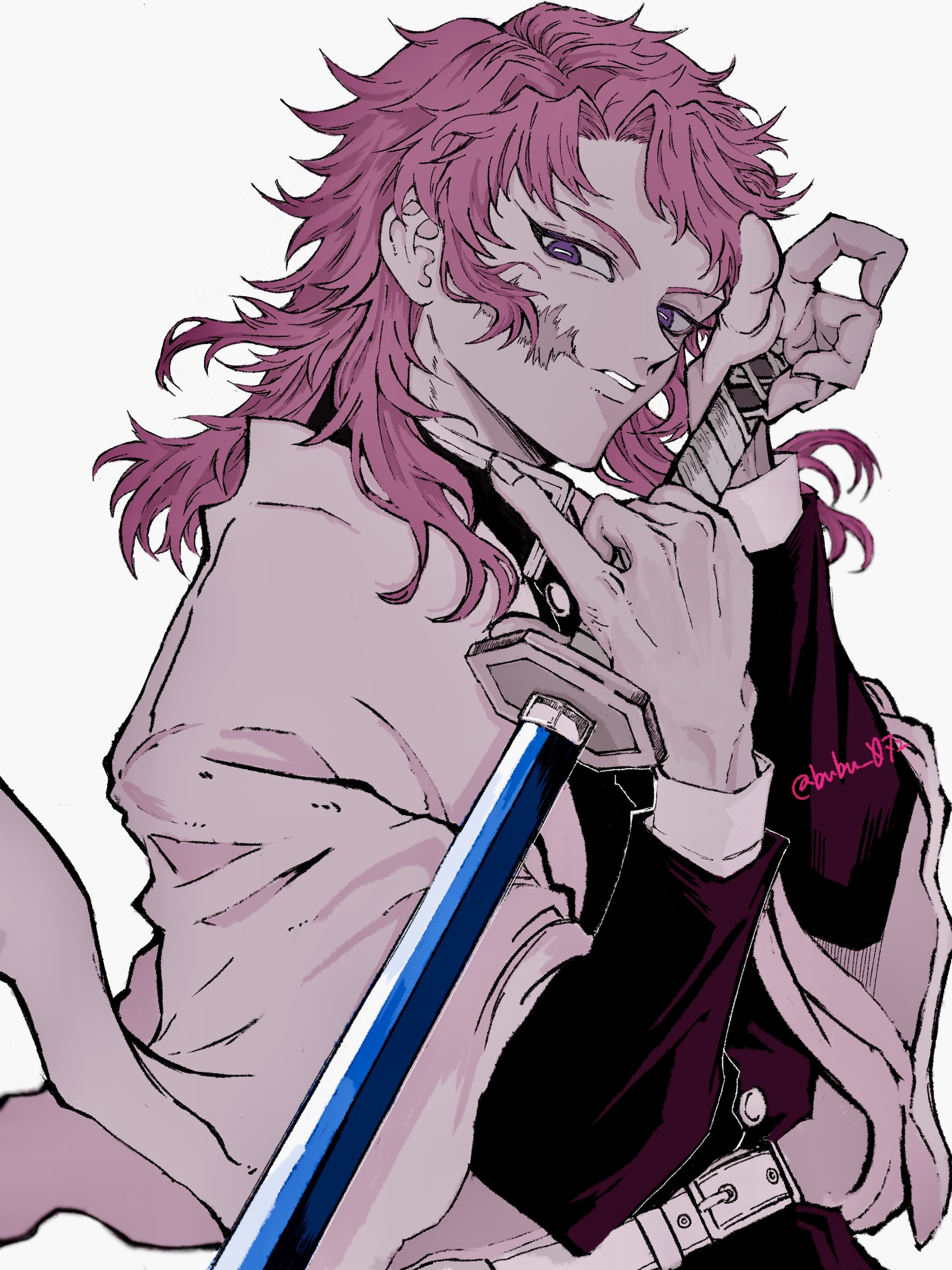 1boyalternate hair colorbeltblack jacketblack pantsbubu 072demon slayer uniformfacial scarhaoriholdingholding swordholding weaponjacketjapanese clotheskatanalong hairlooking at viewermale focuspantspink hairpurple eyesscarscar on cheekscar on facesimple backgroundsolospiked hairswordupper bodyweaponwhite backgroundwhite beltwhite haori