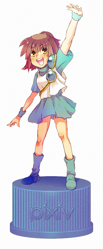 1girlblue skirtbrown hairfemale focushalf updopixiv bottlecapskirtsolowavingwristbandyellow eyes