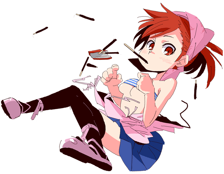 1girlbandanabandeaublack thighhighsblushbreastscamisolefemale focusfoodmary janesmatching hair/eyesmedium breastsmouth holdorange eyesorange hairpockyshoesskirtsolostraplesstank topthighhighstube topunderboob