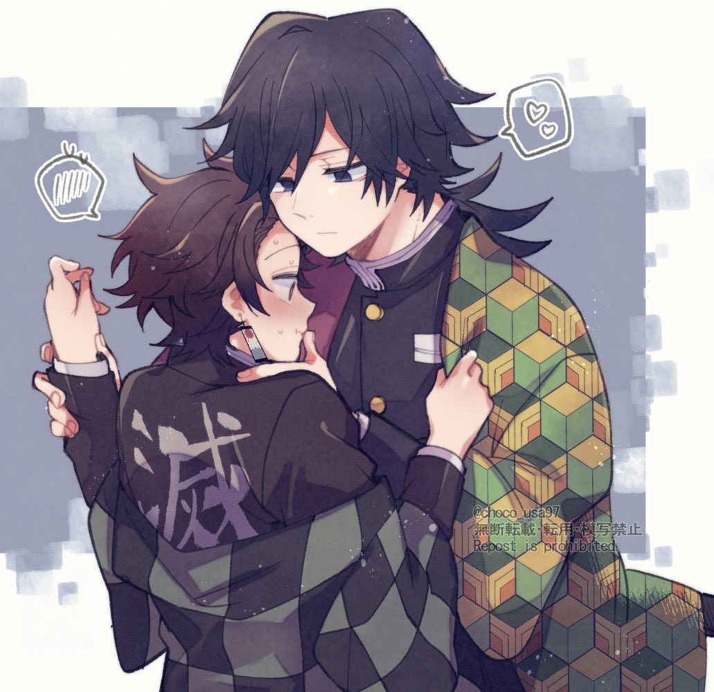 2boysblack hairblack jacketblue eyesblushbrown hairbuttonscheckered haoriclosed mouthclothes writingdemon slayer uniformgold buttonshaorihearthigh collarholding another's wristjacketjapanese clotheskikkoumonlow ponytailmale focusmultiple boysponytailprint haorired haorishort hairspiked hairspoken heartupper bodywatermarkyaoi