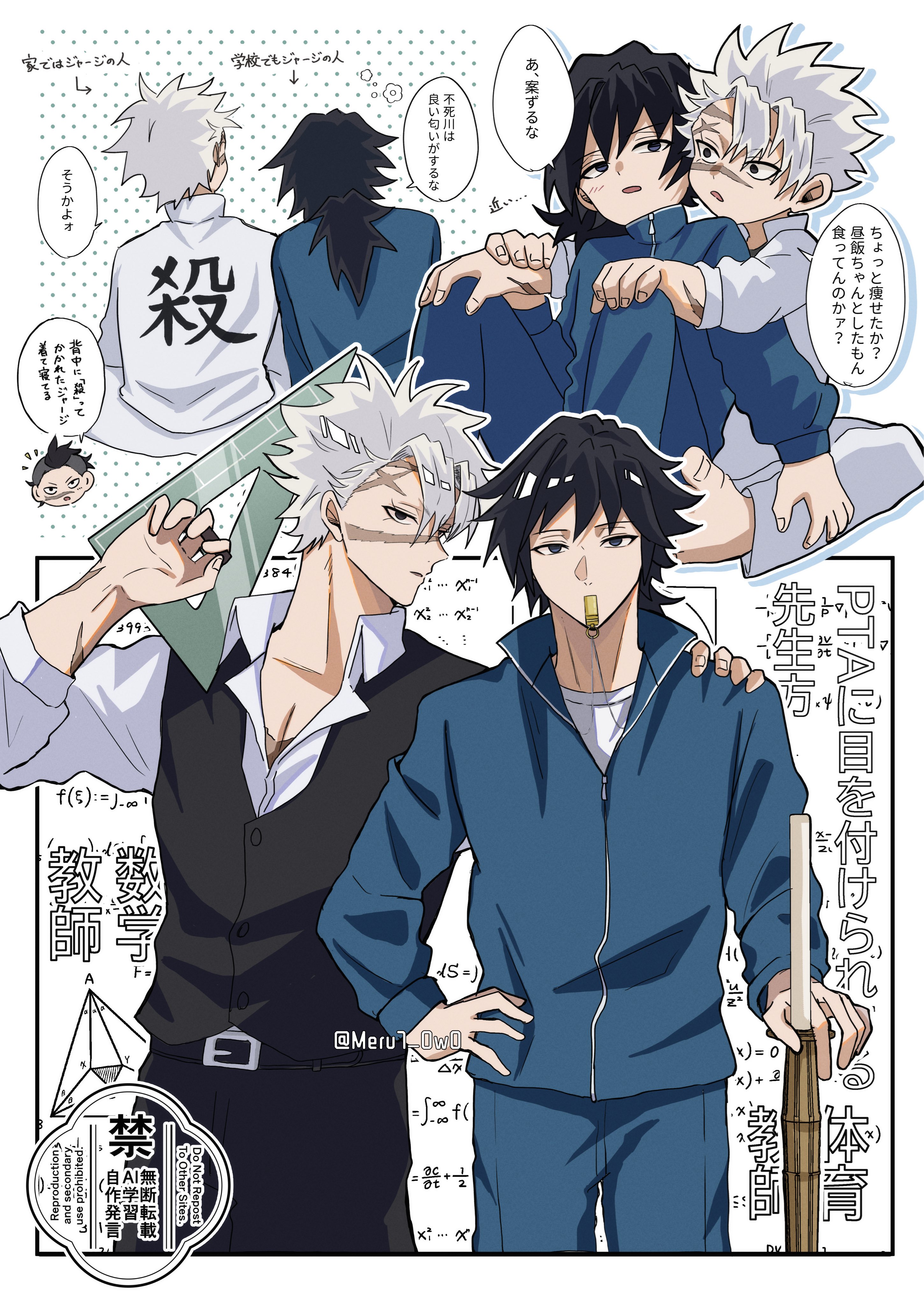 3boysblack hairblack pantsblack vestblue pantscollared shirtfrom behindgrey hairlooking at viewerlow ponytailmale focusmeru7 owomultiple boysmultiple viewspantsponytailscarscar on faceshirtshort hairsittingspiked hairstandingvestwatermarkwhite shirt