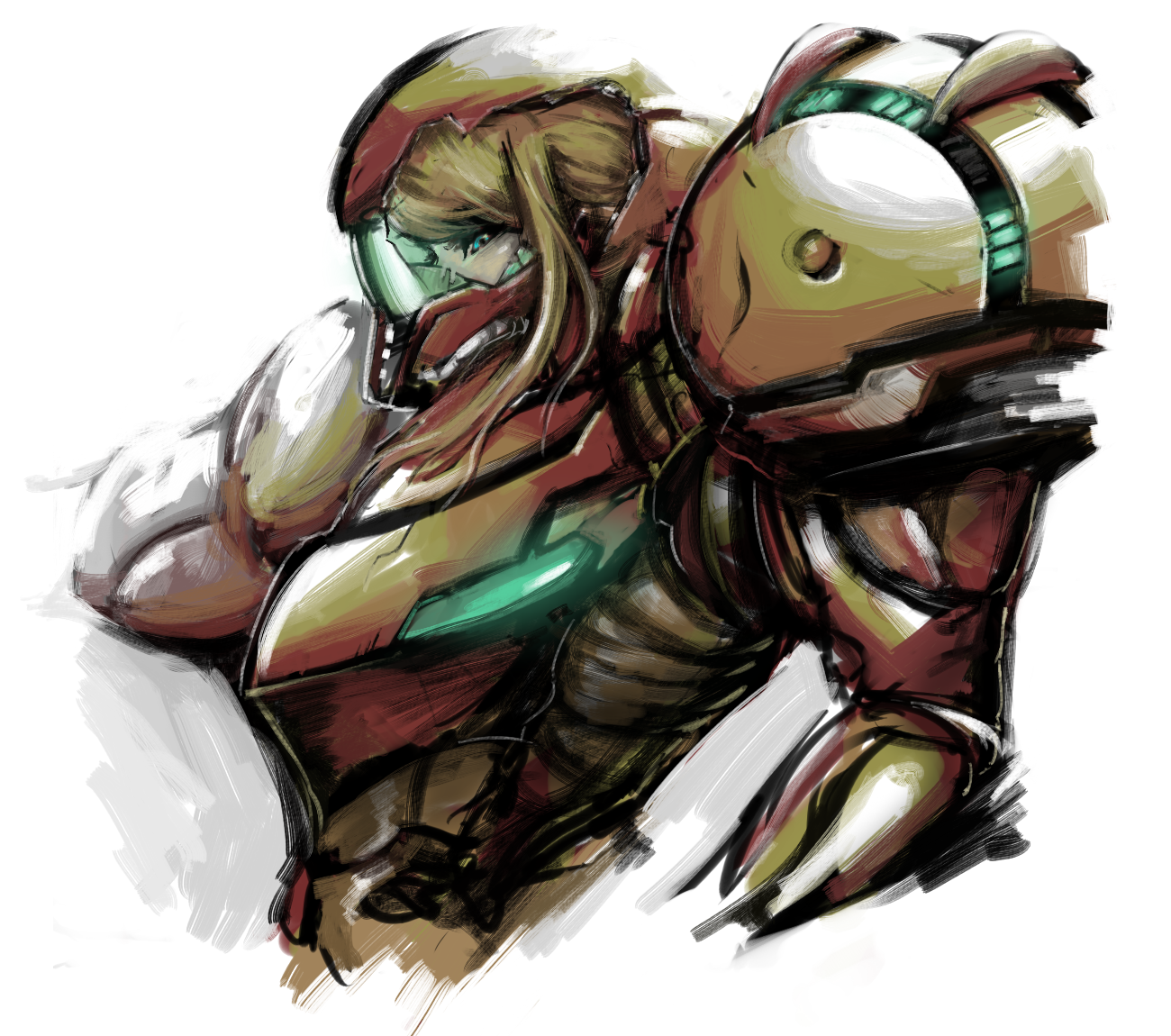 1girlandrogynousarmorblonde hairblue eyesdamagedfemale focushelmetpower armorpower suit (metroid)reverse trapsolovaria suit