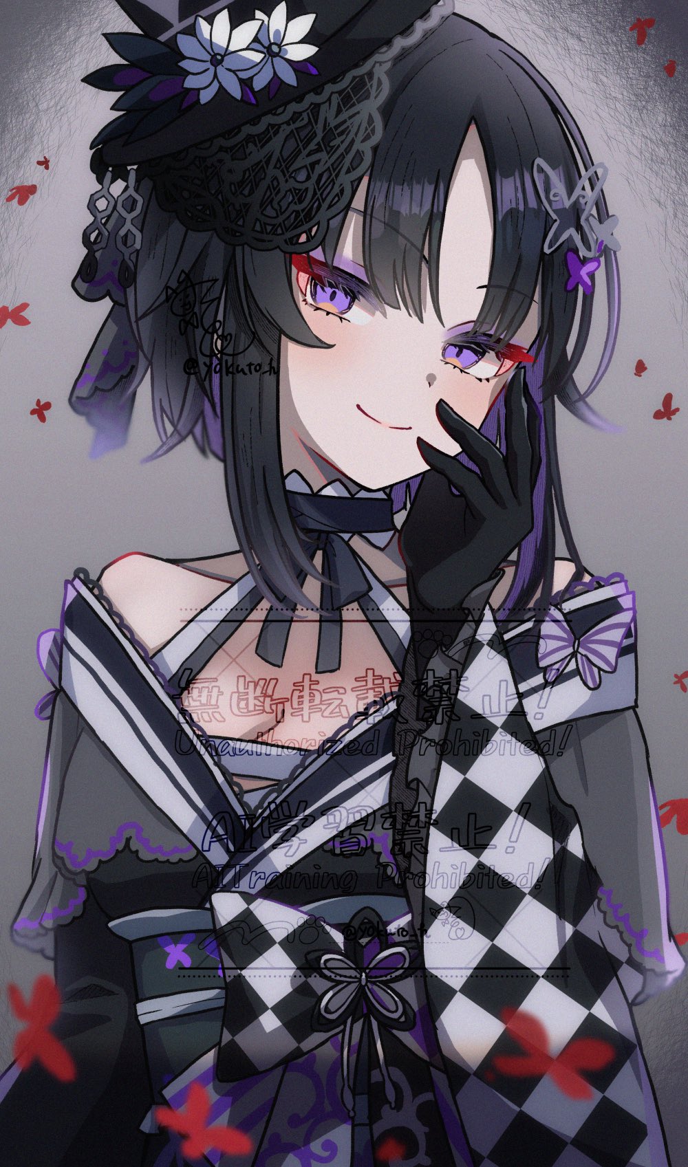 1girlblack glovesblack hairbowbugbutterflybutterfly hair ornamentcheckered bowcheckered clothescheckered sleevescolored inner hairflowerglovesgrey backgroundhair ornamenthalf-closed eyeshand on own cheekhand on own facehathat flowerinsectjapanese clotheskimonolight smilelolita fashionlooking at viewermagical girlmini hatmini top hatmulticolored hairpurple eyesred butterflyshort hairsimple backgroundsolotop hatwa lolita