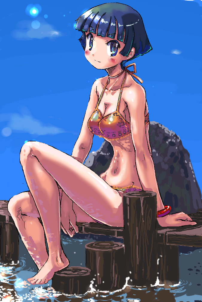 1girlbarefootbikiniblue eyesblue hairdockfeetfemale focusmatching hair/eyesorange bikinishort hairsittingsoaking feetsoloswimsuitwater