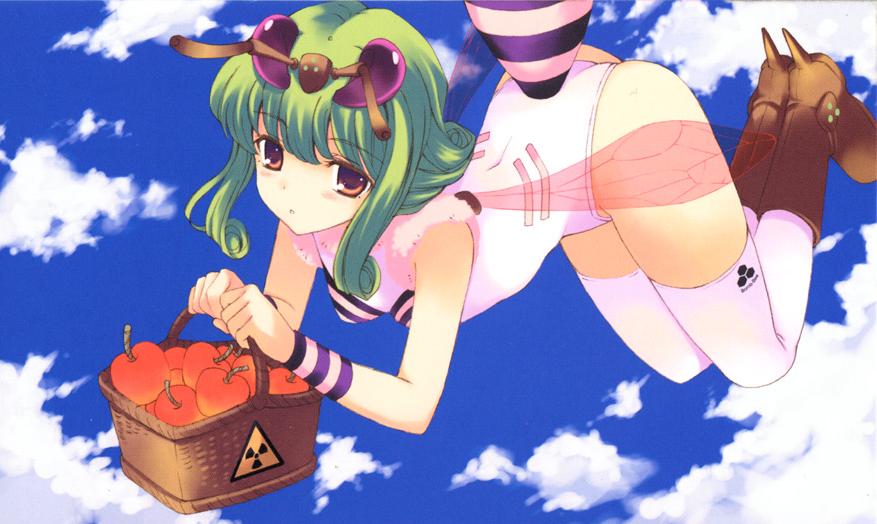 1girlappleassbeebootsbreastsbrown eyesbugfemale focusflyingfoodfruitgreen hairinsectleotardpicnic basketshort hairskysolothighhighswings