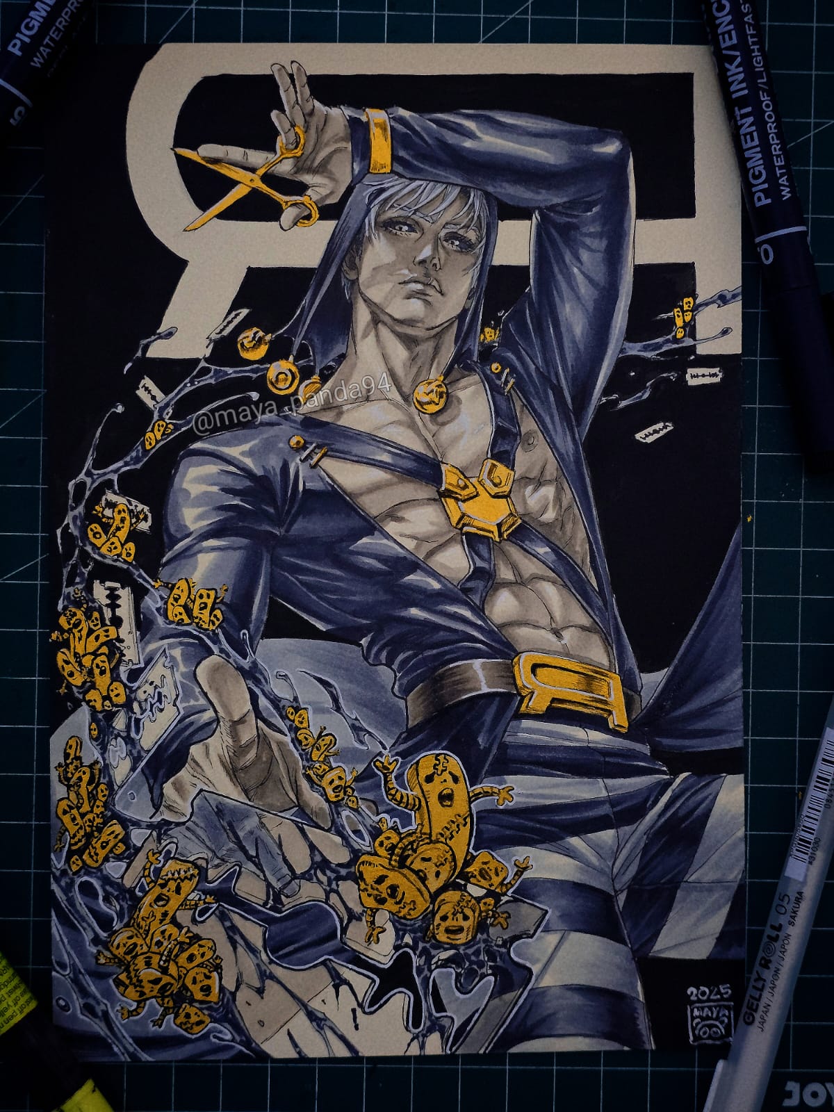 1boy2025absarm upart tools in framebare pectoralsbelt buckleblack coatblack sclerabucklechest harnesscoatcolored scleraharnessholdingholding scissorshoodhood uplimited palettelong sleeveslooking at viewermale focuspantspectoralsrazor bladescissorsshort hairsignaturesolostand (jojo)striped clothesstriped pantstonedtoned maletwitter usernamewhite hair