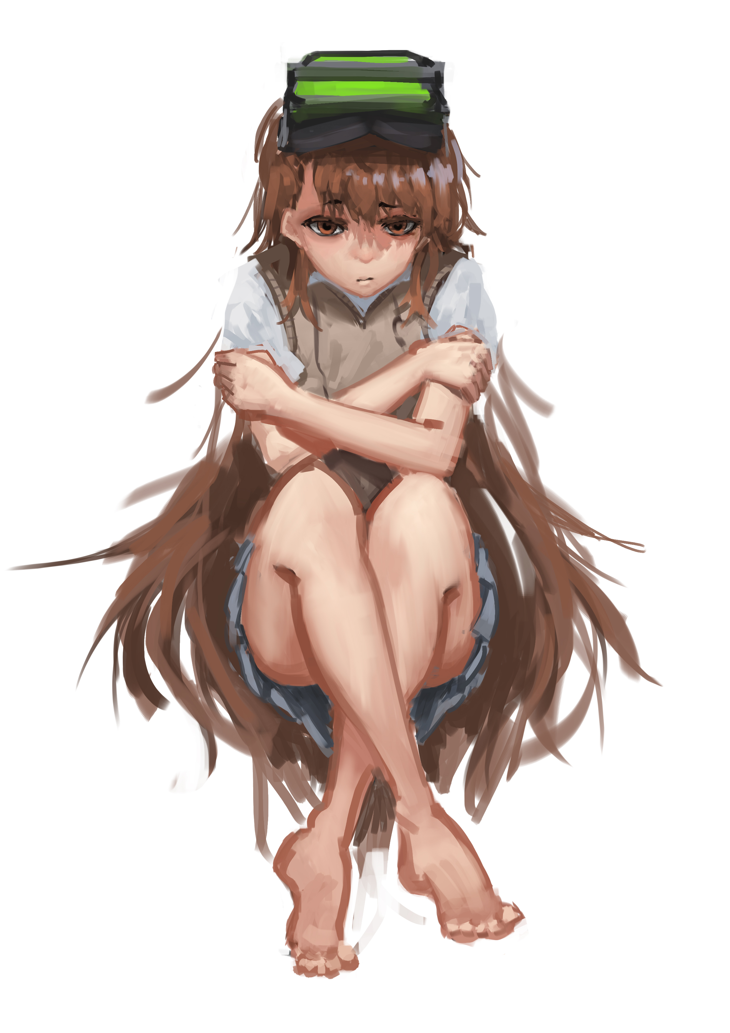 1girlasymmetrical bangsbare armsbare legsbarefootbloodbrown eyesbrown hairbrown sweaterbrown sweater vestbrown vestclosed mouthcrossed legseyewear on headgogglesgoggles on headgrey skirtlong hairminiskirtnight vision devicepleated skirtschool uniformself hugshaded faceshirtshort sleevessimple backgroundskirtsleevelesssleeveless sweatersolosummer uniformsweatersweater vesttokiwadai school uniformvery long hairvestwhite backgroundwhite shirt