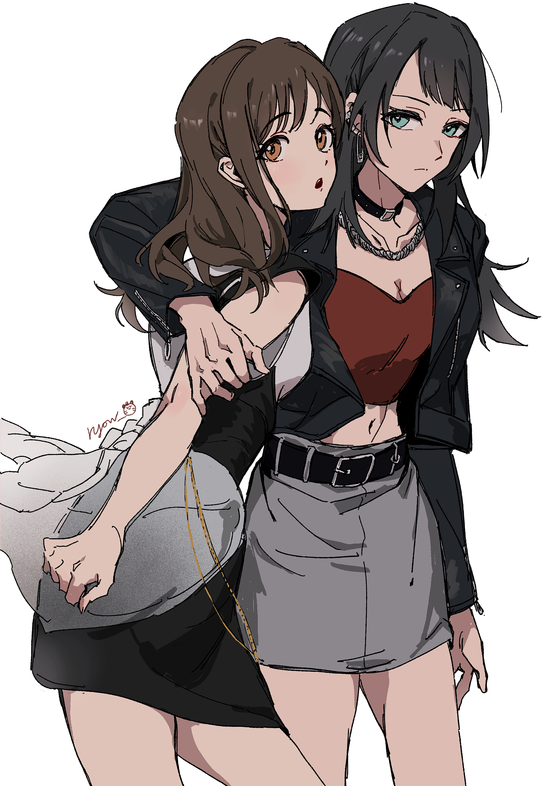 2girlsarm around shoulderarm at sideartist namebeltblack beltblack collarblack dressblack hairblack jacketblue eyesbrown eyesbrown hairclosed mouthcollarcowboy shotdressearclipearringsexpressionlessgrey skirthand on another's armjacketjewelrylapelsleatherleather jacketlong hairlong sleeveslooking at viewermidriffminiskirtmultiple girlsnavelnecklacenotched lapelsopen clothesopen jacketopen mouthpencil skirtred tube topsee-through clothessee-through dress layershort dresssideways glancesimple backgroundskirtsleevelesssleeveless dressstandingstraplessswept bangstanda hazukitube topvoice actor connectionwhite background