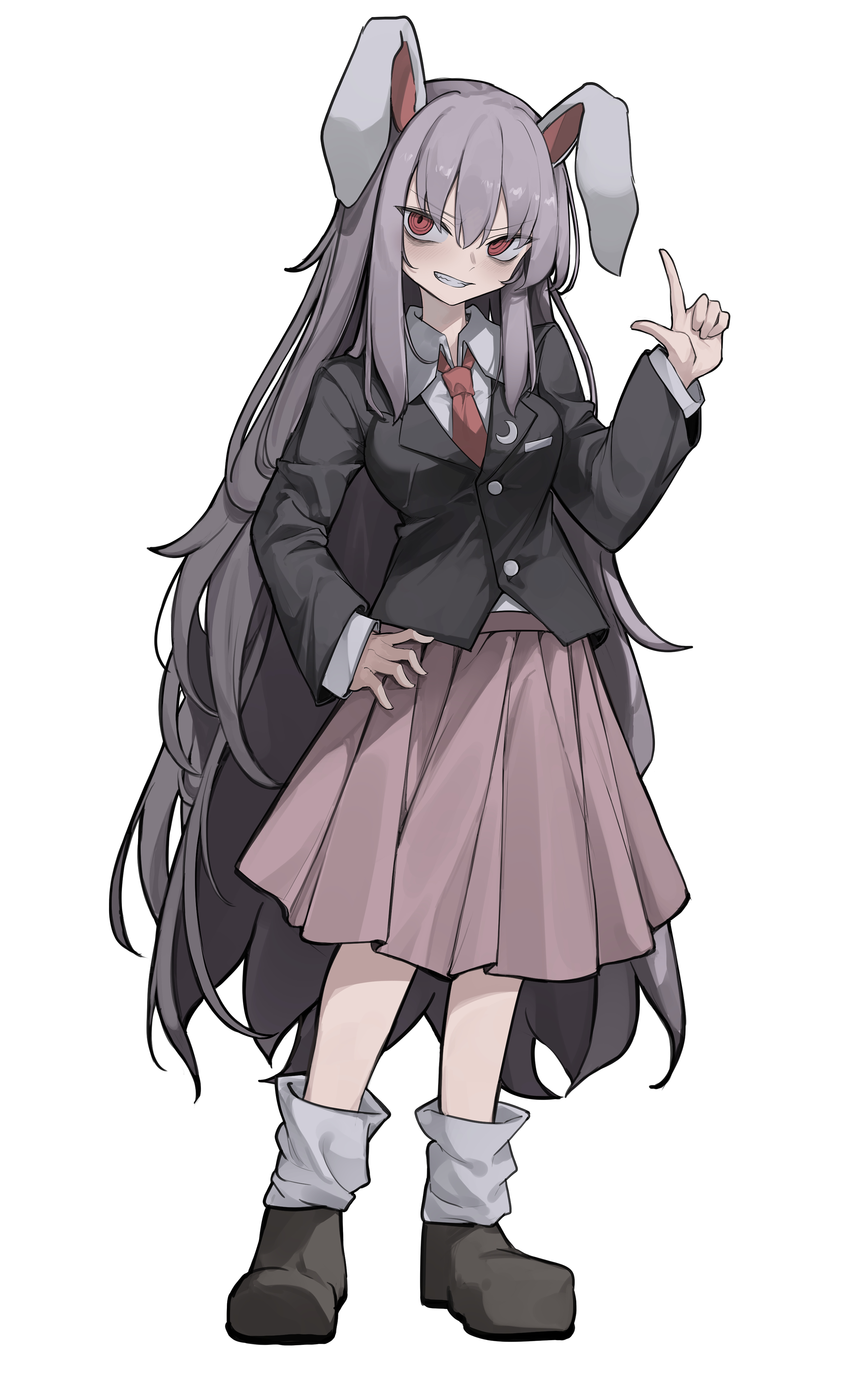 1girlanimal earsblack jacketblazerbuttonscollared shirtcrescentcrescent pinfull bodygrey shoesgrinhand on own hipindex finger raisedjacketlong hairlong sleeveslooking at viewernecktiepink skirtpleated skirtpurple hairrabbit earsrabbit girlred eyesred necktieringed eyesshirtshoessimple backgroundskirtsmilesockssolostandingtachi-every long hairwhite backgroundwhite shirtwhite socks