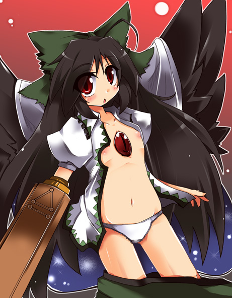 1girlahogearm cannonblack hairbreastsfemale focusflat chesthair ribbonlong hairopen clothesopen shirtpantiesred eyesribbonshirtsolounderwearvery long hairweaponwhite pantieswings