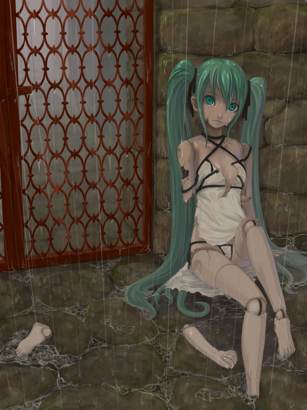 1girlamputeebrokendolldoll jointsfemale focusgreen hairjointslong hairpantiesrainsolotorn clothestwintailsunderwearvery long hair
