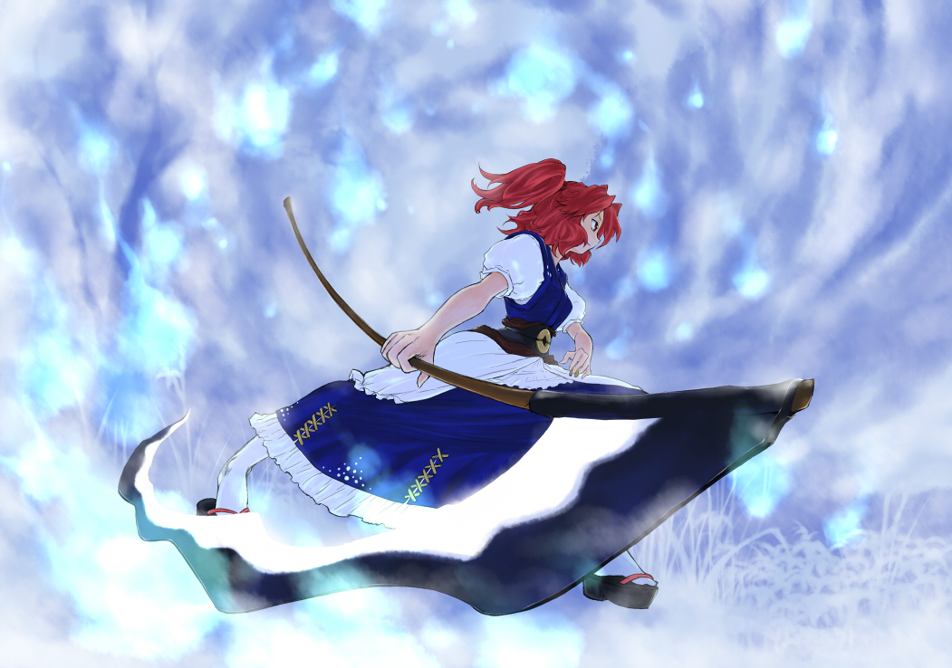 umi (umi02), kagiyama hina, ranka lee, macross, macross frontier, touhou, lowres, 1girl, crossover, female focus, front ponytail, green eyes, m/, microphone, parody, ribbon, seikan hikou, smile, solo