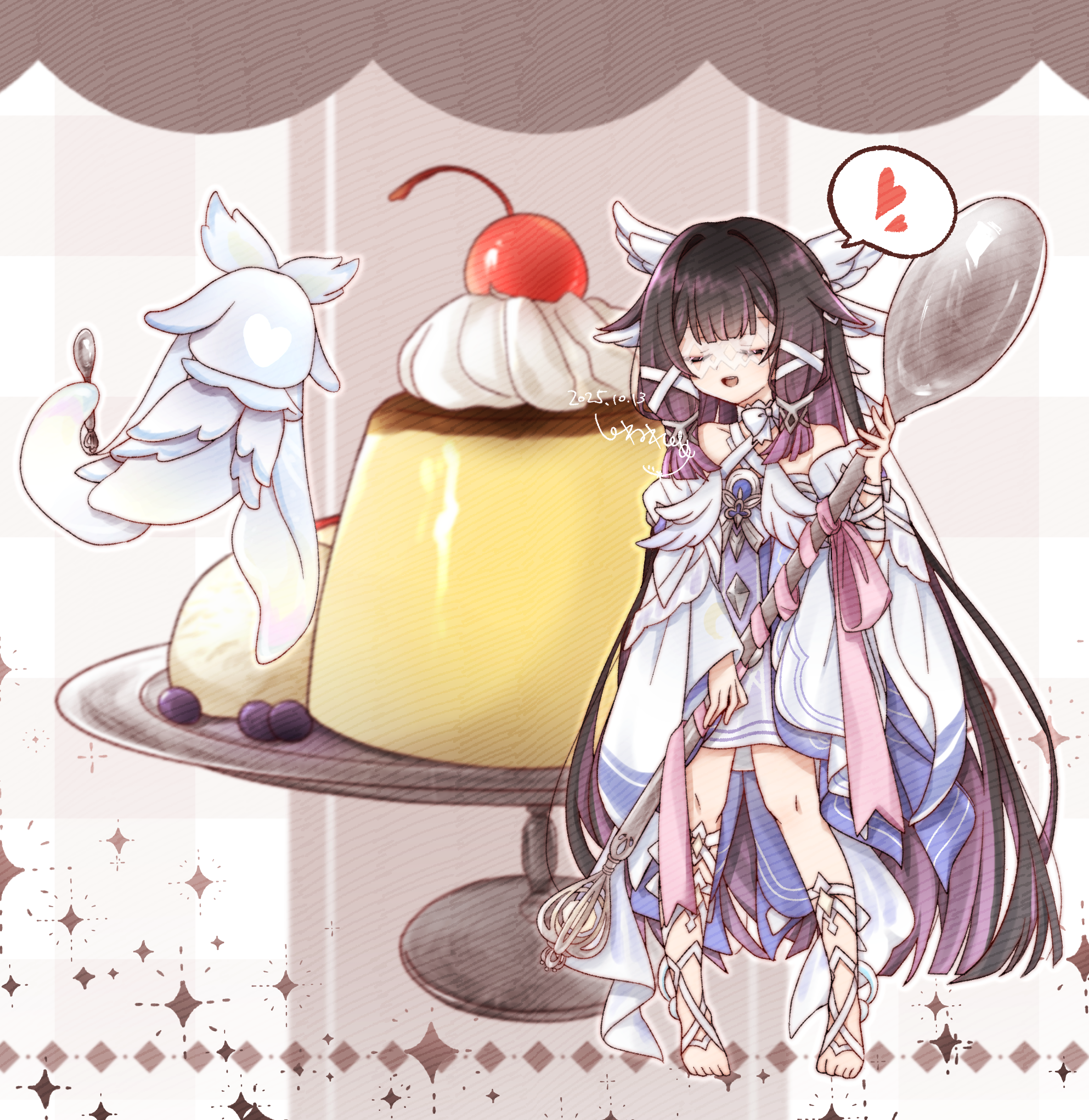 1girlbare shouldersbarefootblack haircherryclosed eyesdateddressfoodfruitfull bodyheartholdingholding spoonkuuhenki (genshin impact)long hairmulticolored hairopen mouthoversized objectpurple hairsignaturesolospoken heartspoonstandingtoesvery long hairwhipped creamwhite dress