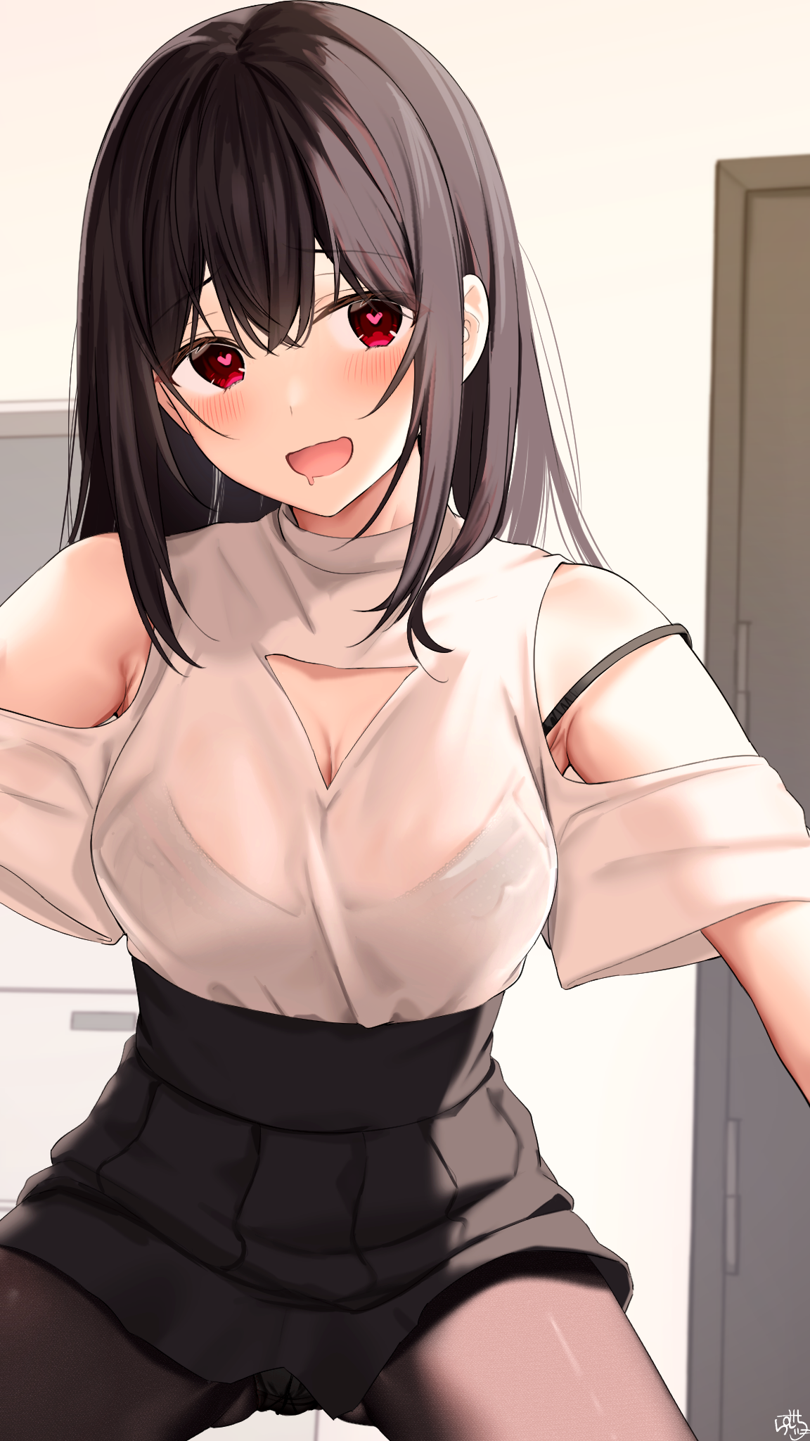 :d1boy1girlarmpit creaseblack hairblack skirtblack thighhighsblushbra strapbreastscleavagecleavage cutoutclosed eyesclothing cutoutheartheart-shaped pupilslarge breastslooking at vieweropen mouthsalivaskirtsmilesolosymbol-shaped pupilsthighhighs
