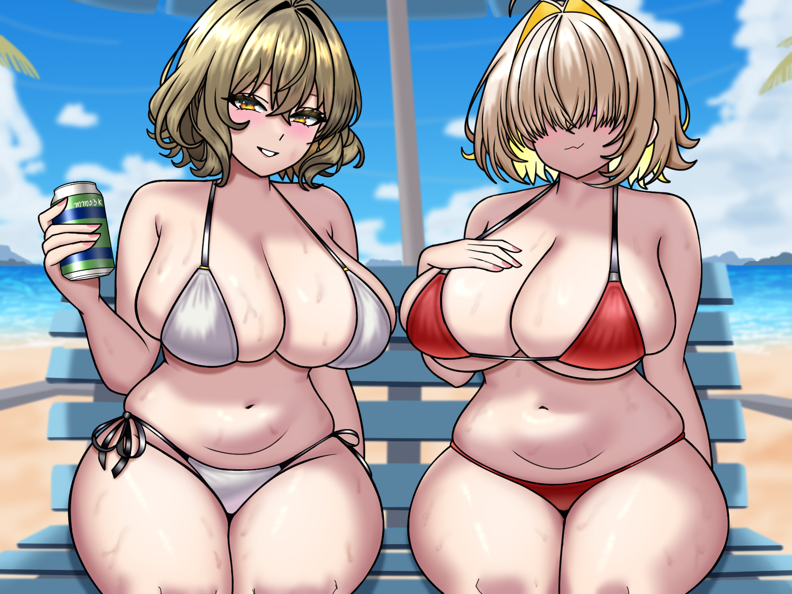 2girlsahogebeachbeach umbrellabellybenchbikiniblonde hairblushbreastsbrown haircancleavagecovered eyesdrink canhair intakeshair over eyeshand on own chestholdingholding canhuge breastslipsmuffin topmultiple girlsnaveloceanon benchoutdoorspink eyespink nailsplumpred bikinishort hairside-tie bikini bottomsittingskindentationskysmilesoda canswimsuitthick thighsthighsumbrellawhite bikiniyellow eyes