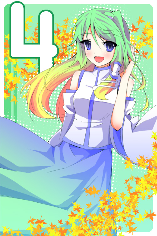 1girlautumn leavesblue eyesblue skirtblushcowboy shotdetached sleevesfemale focusleaflooking at viewernontraditional mikoskirtsolostandingtareme