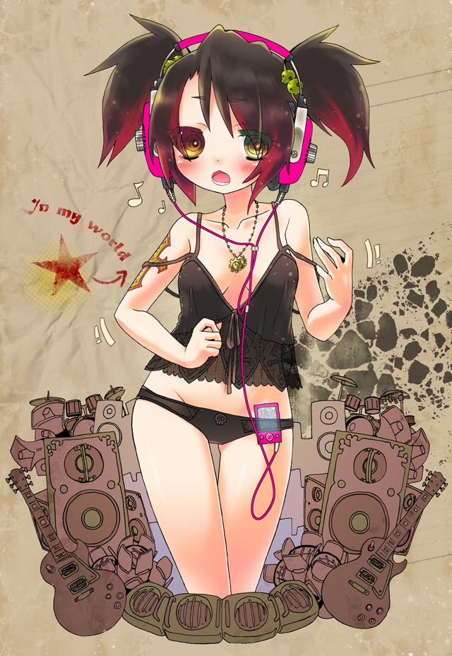 1girlair guitaramplifierbare legsbare shouldersblack hairblack pantiesblushbreastsbrown backgroundbrown eyescamisolecleavagecowboy shotdigital media playerfemale focusgradient hairgroinguitarheadphonesheterochromiainstrumentipodjewelrylistening to musiclowleglowleg pantiesmulticolored hairmusical notenecklaceobject in clothesobject in pantiespantiesred hairringed eyessee-through clothesshort hairsmall breastssolotattootwintailsunderwearunderwear only