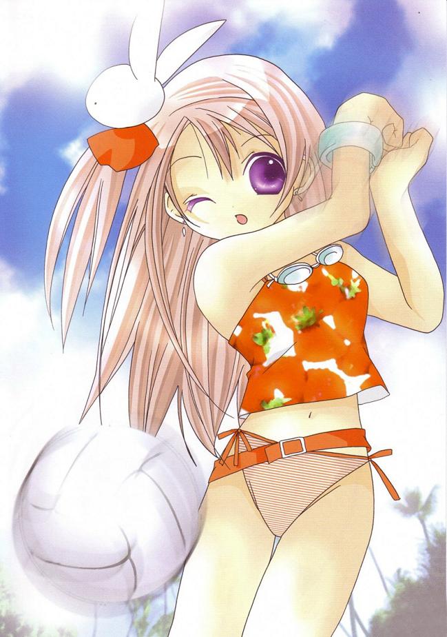 sagano aoi, momo mizrahi, xenosaga, 00s, 1girl, aoi sagano, bed, blush, brown eyes, female focus, loli, lying, short hair, smile, solo, stuffed animal, stuffed rabbit, stuffed toy