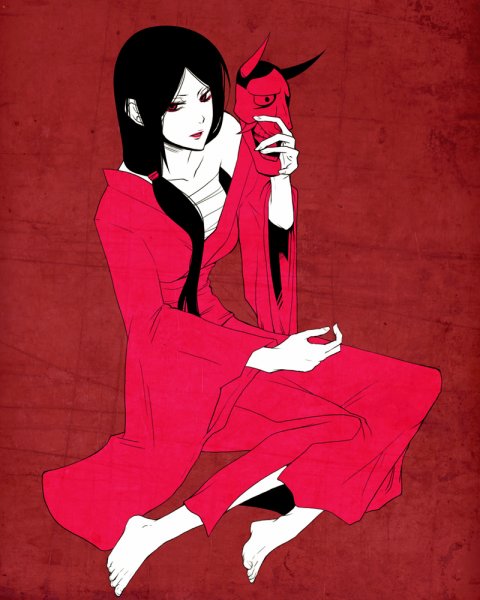 1girlbarefootblack haircapelli nerifemale focusgiapponehannyajapanjapanese clotheskimonkimonolipsticklong hairmakeupmasknoh masksarashisittingsolo
