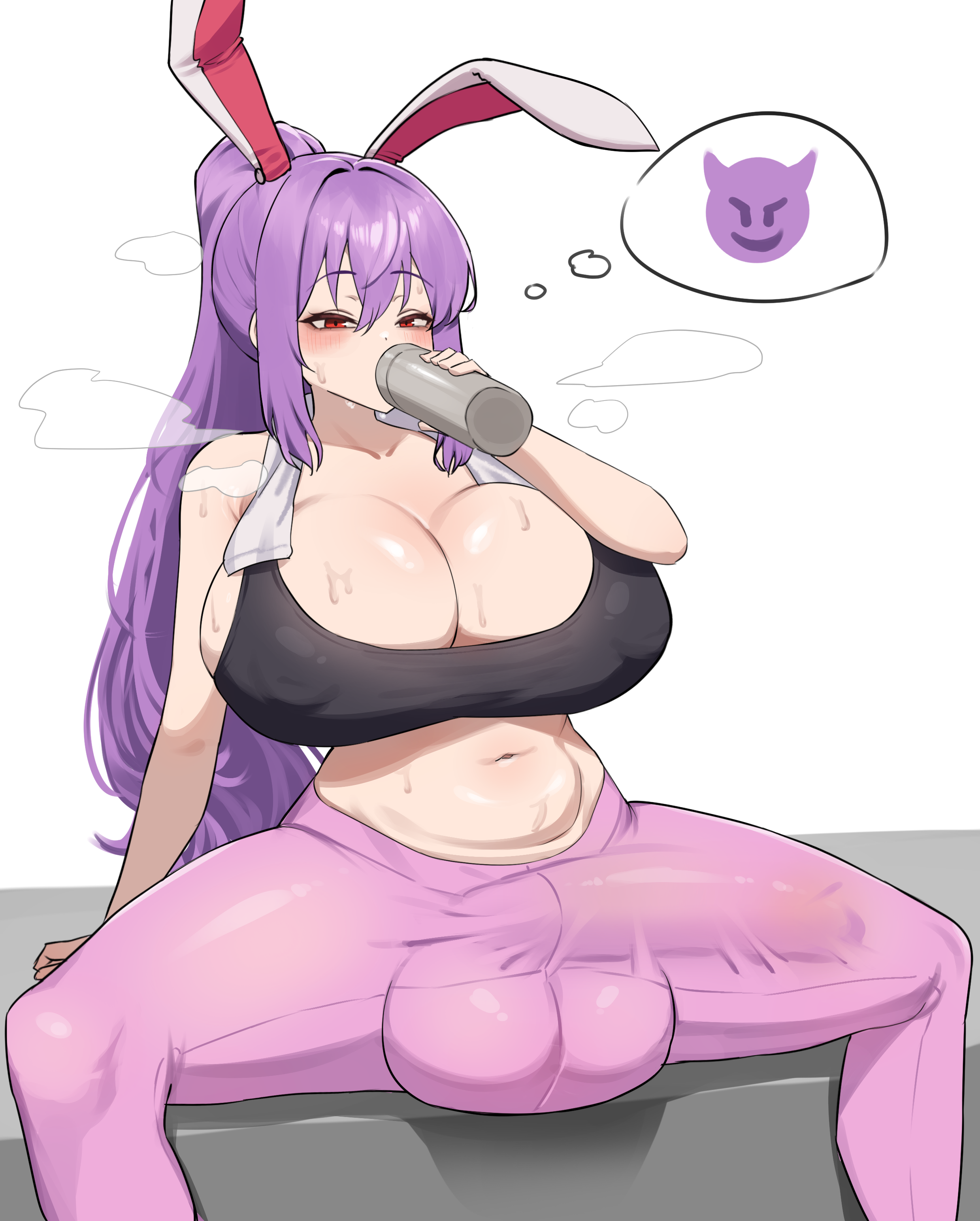 1girlalternate costumealternate hairstyleanimal earsblack tank topblushbreastsbulgecovered erect nipplesdemon emojidrinkingerectionerection under clothesfutanarigym uniformhair intakeshuge breastshuge penishuge testicleslong hairpantspenispink pantsponytailpurple hairrabbit earsrabbit girlsidelockssimple backgroundsolospeech bubblesweattank toptesticlesthought bubblewhite background