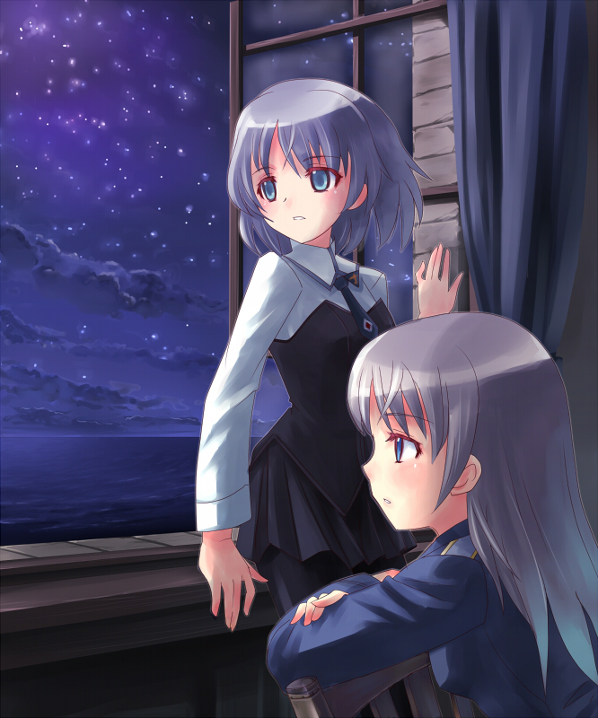 ha (huton in mach), w (arknights), arknights, commentary request, highres, 1girl, antenna hair, closed mouth, demon girl, demon horns, demon tail, full body, game screenshot inset, greyscale, horns, looking at viewer, medium hair, monochrome, sketch, tail, upper body